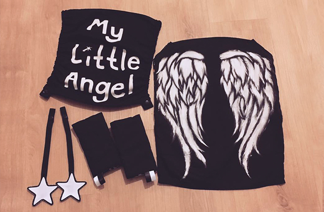 Got my friend to paint a baby version of Daryl Dixon’s angel wing jacket onto my Tula baby carrier. She did an amazing job! Little one layette sewed the set for me. Totally love it! Pics below.